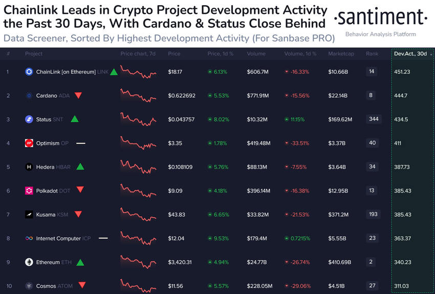 Santimentin äskettäin tekemän lohkoketjuanalyysin mukaan Chainlink, Cardano ja Polkadot johtavat ryhmää, jolla on ollut eniten github-aktiviteettia viimeisten 30 päivän aikana. Metriikka, joka on indikaattori tarpeettomista projektipanostuksista ja parannuksista, nostaa mainitut digitaaliset hyödykkeet keskeisiksi pelaajiksi lohkoketjujen innovaatiokilpailussa.