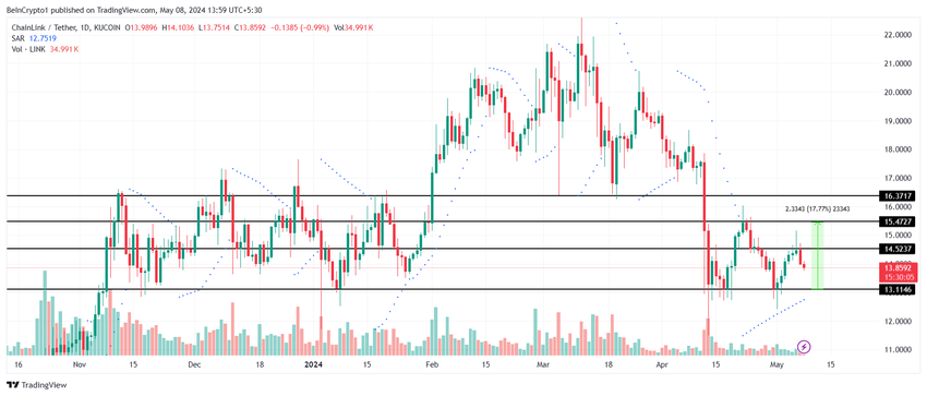 Chainlinkin hinta on ollut alle 15 dollaria koko tämän kuun ajan, ja sen äskettäinen yritys rikkoa 14,5 dollarin vastus epäonnistui. Sama tunne ei kuitenkaan resonoi sijoittajien kanssa, jotka ovat edelleen optimistisia nousun suhteen.