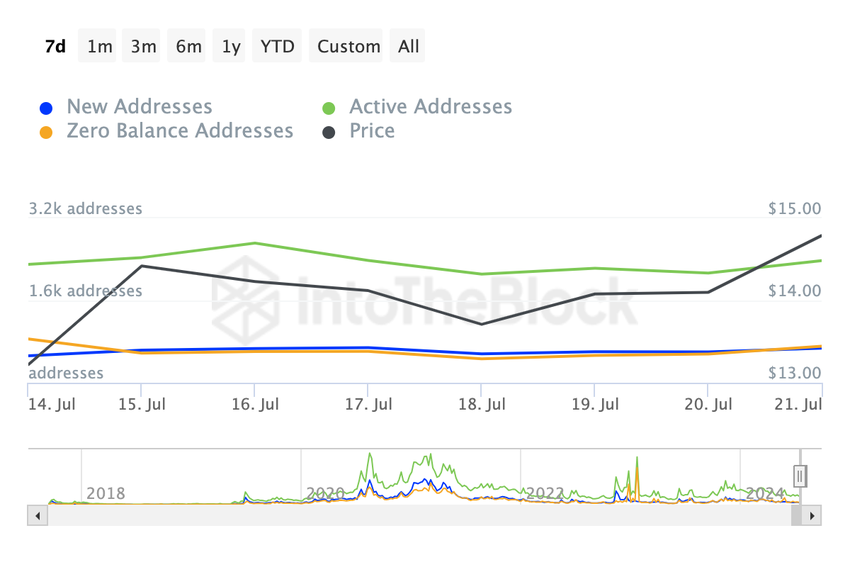 Uusien ja aktiivisten osoitteiden lisääntyminen verkossa tukee myös mahdollista kasvua. IntoTheBlockin mukaan molemmat mittarit olivat kasvaneet viimeisen seitsemän päivän aikana.