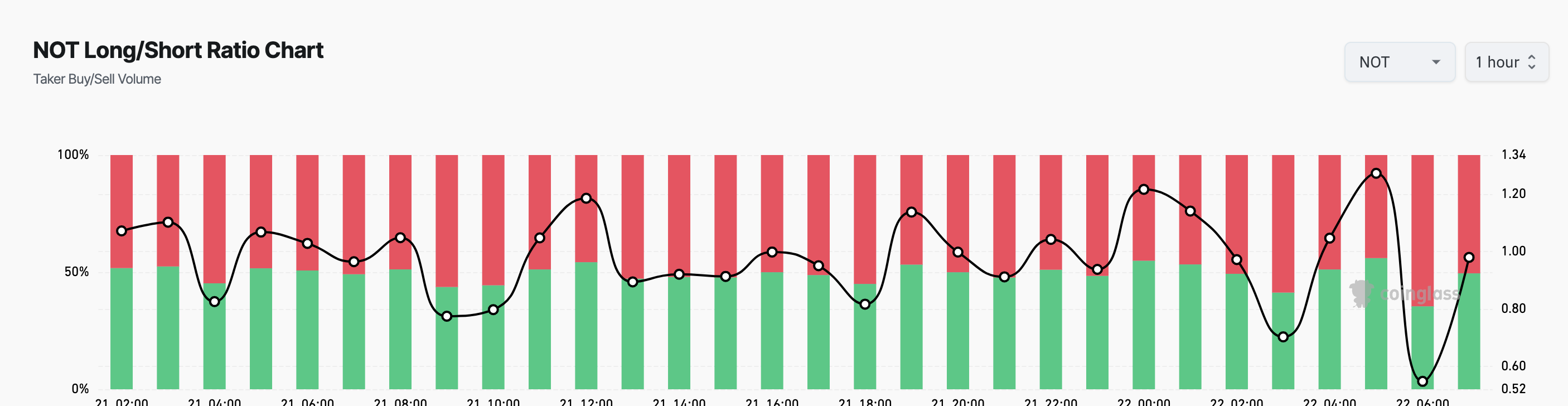 Coinglassin mukaan Notcoinin pitkä/lyhyt-suhde on saavuttanut tarkan lukeman 1. Tämä suhde on sijoittajien odotusten barometri.