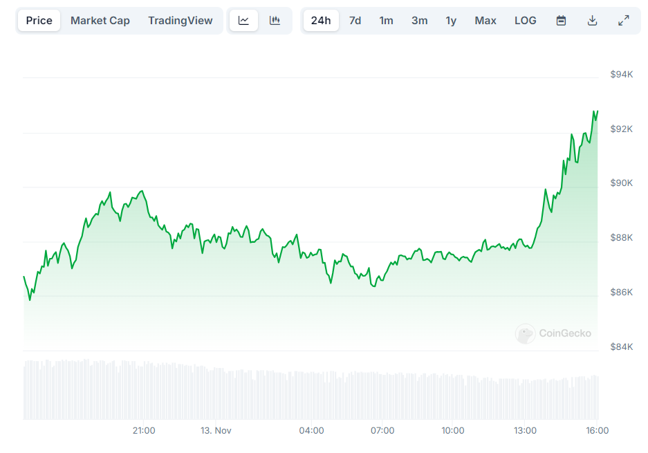 Bitcoin kohosi ennätyskorkeuteen 92 000 dollaria sen jälkeen, kun Yhdysvaltain kuluttajahintaindeksi (CPI) paljasti inflaation nousseen 2,6 %:iin vuodentakaisesta lokakuussa, nousten 2,4 %:sta syyskuussa.