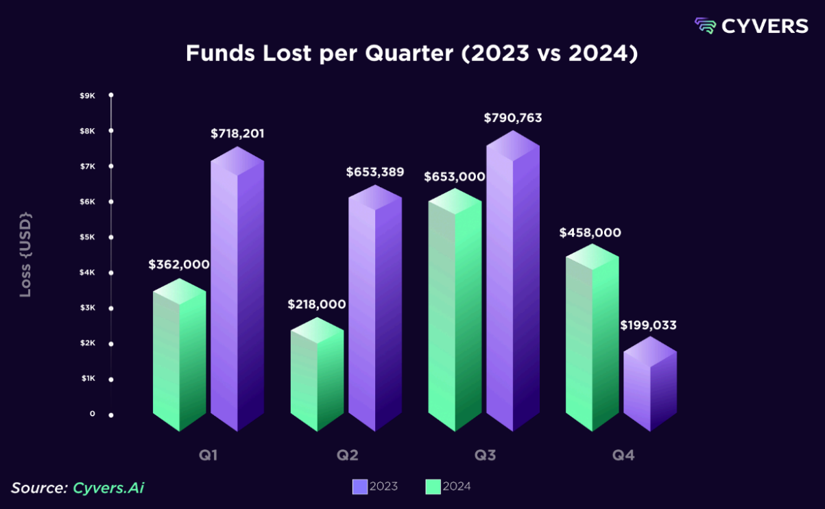 Myös älysopimusten haavoittuvuudet hallitsivat hyökkäysmaisemaa, erityisesti DeFi-sektorilla. Vuoden 2024 kolmas neljännes oli pahin tappioiden suhteen, ja tänä aikana varastettiin 790 miljoonaa dollaria.
