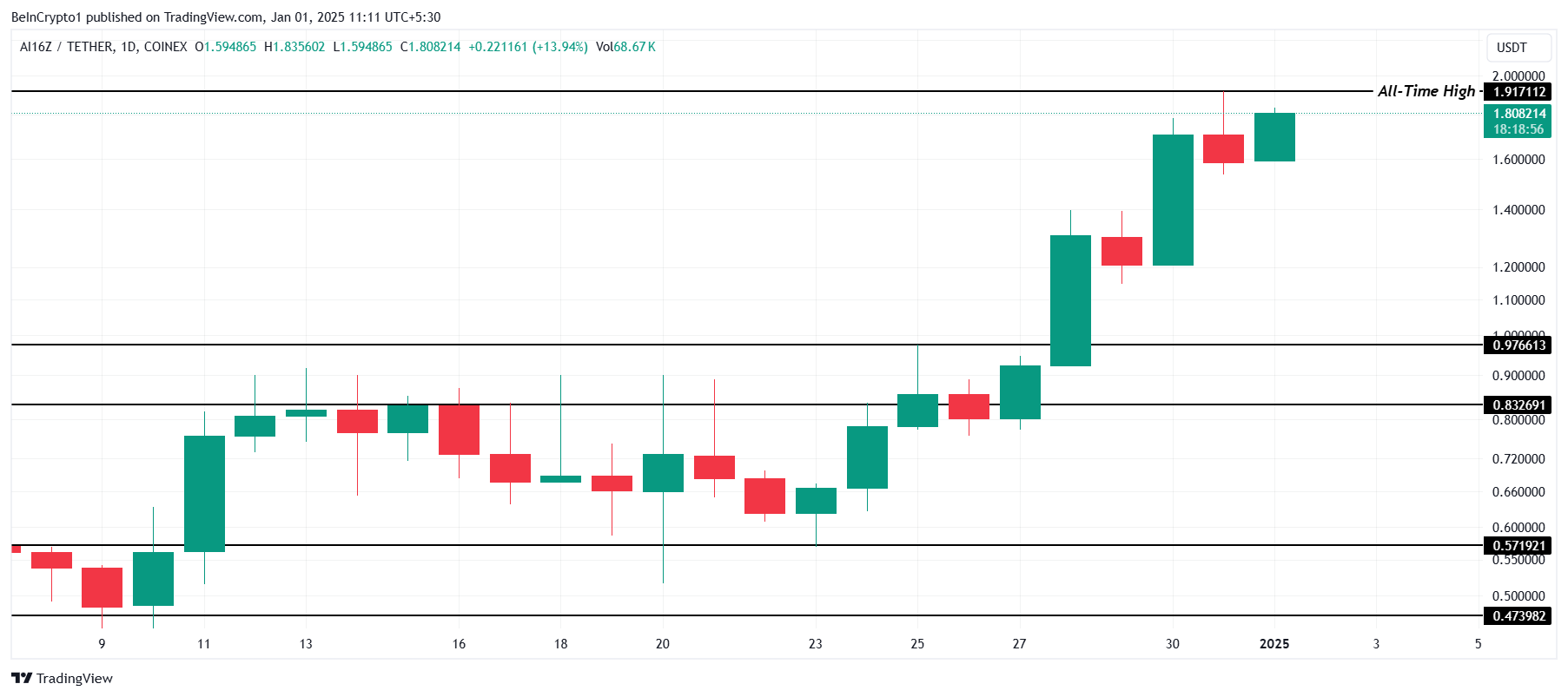AI16Z saavutti uuden kaikkien aikojen huipun 1,91 dollaria viimeisen 24 tunnin aikana, jota vauhditti kasvava odotus vuodelle 2025. Altcoin on kuitenkin sittemmin laskenut, ja sen hinta on 1,80 dollaria kirjoitushetkellä, mikä heijastaa pientä vetäytymistä markkinoiden vakiintuessa.