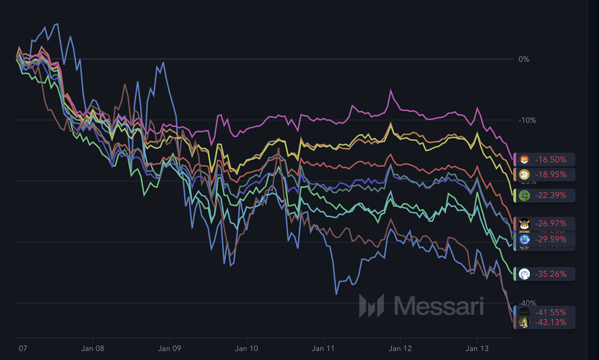 Meemikolikot ovat toisella sijalla mielipidejakaumassa, heti tekoälyn jälkeen, ja ovat olleet yksi tunnistetuimmista narratiiveista kryptossa vuosia, mutta vuosi 2025 on alkanut heikosti niiden osalta. Kaikki top 10 meemikolikot ovat olleet punaisella viimeisen seitsemän päivän aikana, ja SPX ja FARTCOIN ovat kärsineet yli 40 prosentin tappioista.