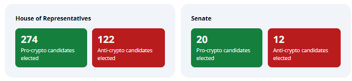 Republikaanipuolueen puhdas voitto edustajainhuoneessa ja senaatissa on lähettänyt selvän signaalin markkinoille. 274 kryptoa tukevaa ehdokasta valittiin edustajainhuoneeseen ja 20 senaattiin, mikä näyttää tekevän poliittisesta kentästä yhä suotuisamman kryptovaluuttojen käyttöönotolle. Sitä vastoin vain 122 kryptoa vastustavaa lainsäätäjää valittiin edustajainhuoneeseen ja 12 senaattiin, Stand With Crypton mukaan.