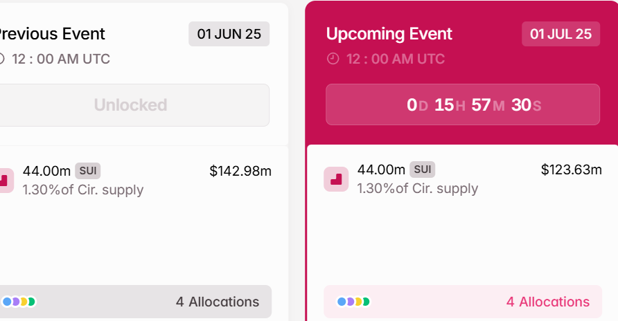Myös tämän viikon kryptouutisissa on 123 miljoonan dollarin SUI-unlock tiistaina, 1. heinäkuuta. Tämä unlock-kierros vapauttaa 44 miljoonaa SUI-tokenia, mikä muodostaa 1,30 % verkon liikkeessä olevasta tarjonnasta.