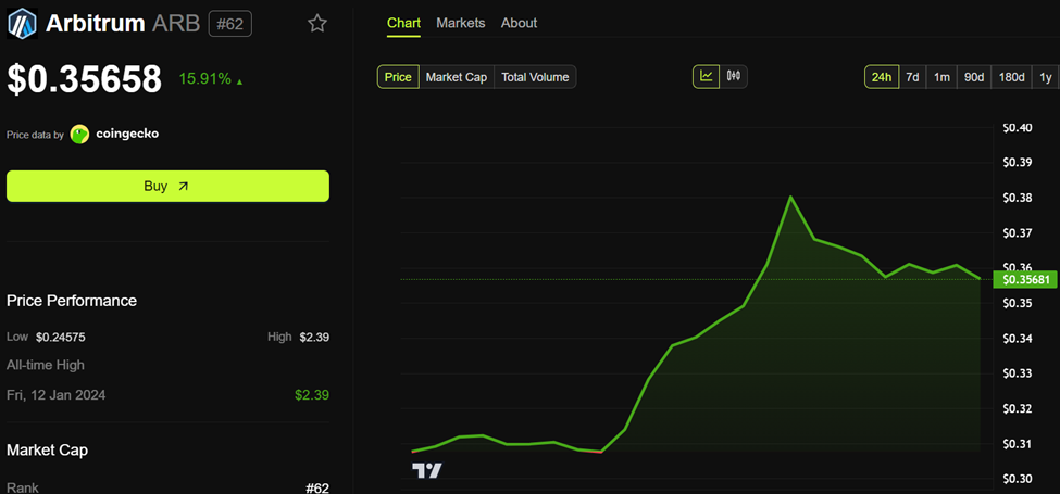 Tämän odotuksen keskellä Arbitrumin ARB-tokenin hinta oli 0,35658 dollaria, nousua yli 15 % viimeisen 24 tunnin aikana.
