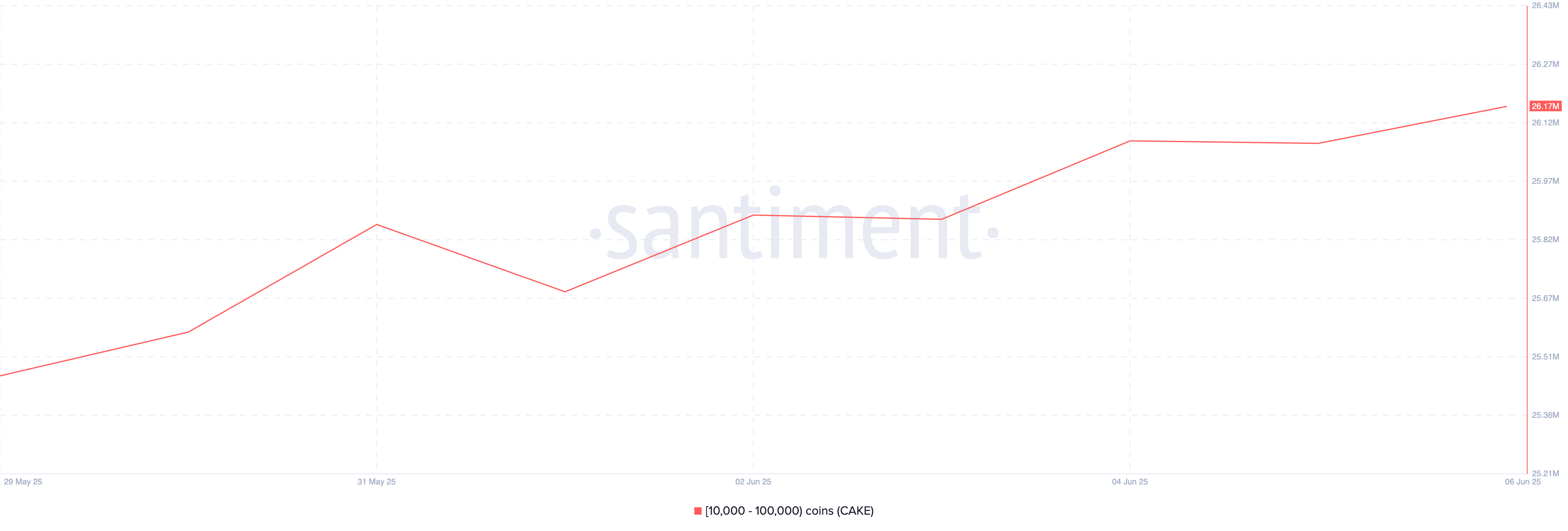 PancakeSwapin oma token, CAKE, on yksi tokeneista, joita kryptovaltaita ostivat tällä viikolla. Santimentin tietojen mukaan valasosoitteet, jotka pitävät hallussaan 10 miljoonan ja 100 miljoonan CAKE-tokenin välillä, hankkivat 710 000 tokenia tarkastelujakson aikana.