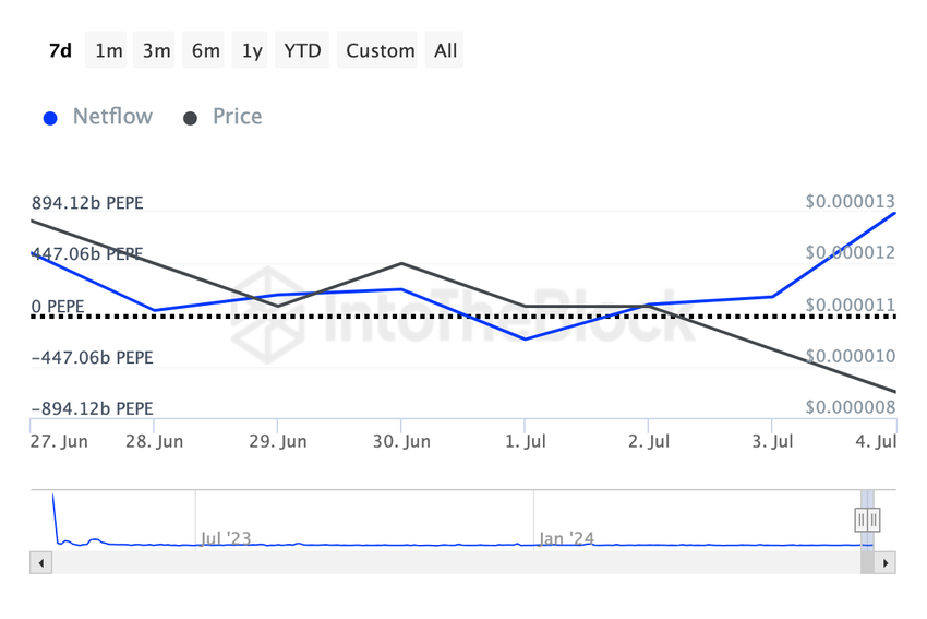 PEPEn Large Holder Netflow -katsaus osoittaa huikean 2237,18 %:n kasvun viimeisen seitsemän päivän aikana. Tämä tarkoittaa, että PEPE:tä ostavat kryptovalaat ylittivät sen myyjät edellä mainitulla suhteella.