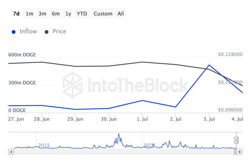 Sisäänvirtaus osoittaa vahvaa ostoaktiivisuutta markkinaosapuolilta, joilla on 0,1–1% kryptovaluutasta. Tiistaina 2. heinäkuuta sisäänvirtaus oli 61,88 miljoonaa DOGEa.