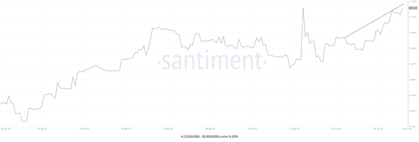 Koska ETH:lla on vahva korrelaatio OP:n kanssa, valaat pitävät sopivana ostaa tokenia alempana ennen mahdollisen rallin alkua.