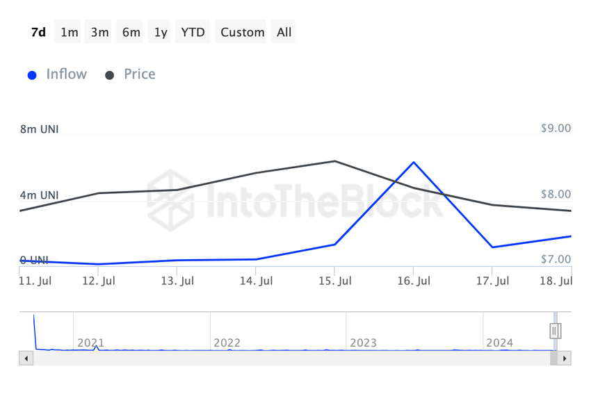 IntoTheBlockin mukaan Uniswapin suurten haltijoiden sisäänvirtaukset kasvoivat 1 570 % viimeisen seitsemän päivän aikana. Kun tämä mittari kasvaa, se tarkoittaa, että kryptovalaat ostavat, ja kun se laskee, se tarkoittaa, että he päästävät irti joistakin omistuksistaan.