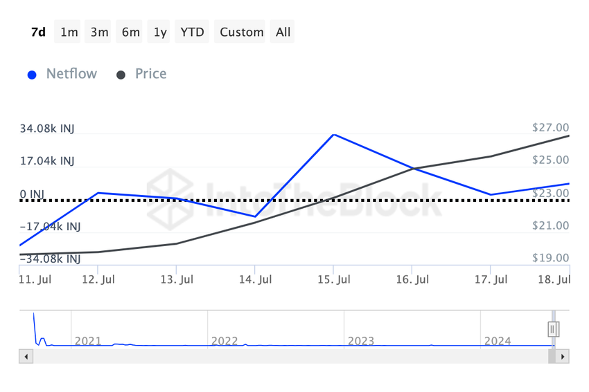 IntoTheBlockin mukaan suurten haltijoiden nettovirta kasvoi huikeat 141.50% viimeisen seitsemän päivän aikana. Tämä tarkoittaa, että valaat, jotka ostivat INJ:n, olivat paljon korkeammalla tasolla kuin ne, jotka myivät INJ:tä.