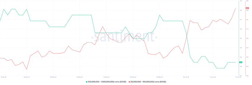 Jälleen tällä viikolla valaat eivät myyneet omistuksiaan Santimentin tietojen mukaan. Alla oleva kaavio osoittaa, että 10–1 miljardin DOGE:n hallussa olevien osoitteiden määrä kasvoi. 19. heinäkuuta 591 oli niitä, jotka ostivat 10–100 miljoonaa.