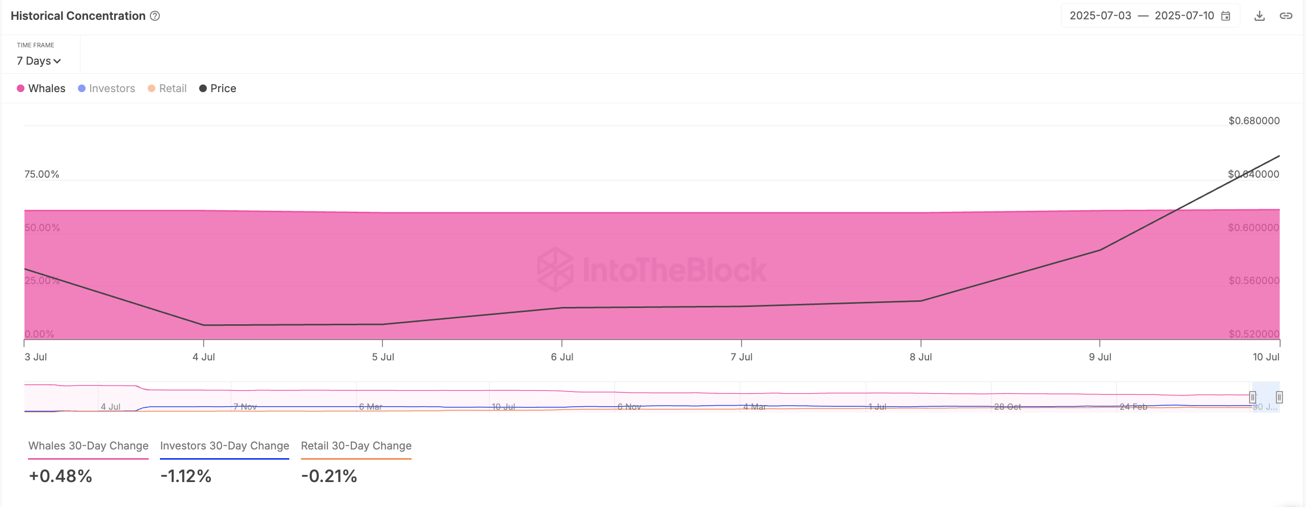Kun omaisuusvaran suurten haltijoiden nettovirta kasvaa positiivisesti, yli 1% omaisuusvaran liikkeessä olevasta tarjonnasta hallitsevat lompakot keräävät lisää kolikoita. Tämä viittaa näiden avainhaltijoiden kasvavaan luottamukseen ja vihjaa jatkuvasta hintarallista, jos he ylläpitävät kysyntää.