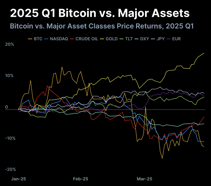 Bitcoin lisäsi dominanssiaan Q1 2025, vastaten 59,1 % krypton kokonaismarkkina-arvosta. Se ei ole pitänyt tätä markkinaosuutta sitten vuoden 2021, mikä symboloi kuinka paljon vakaa se on ollut altcoineihin verrattuna.