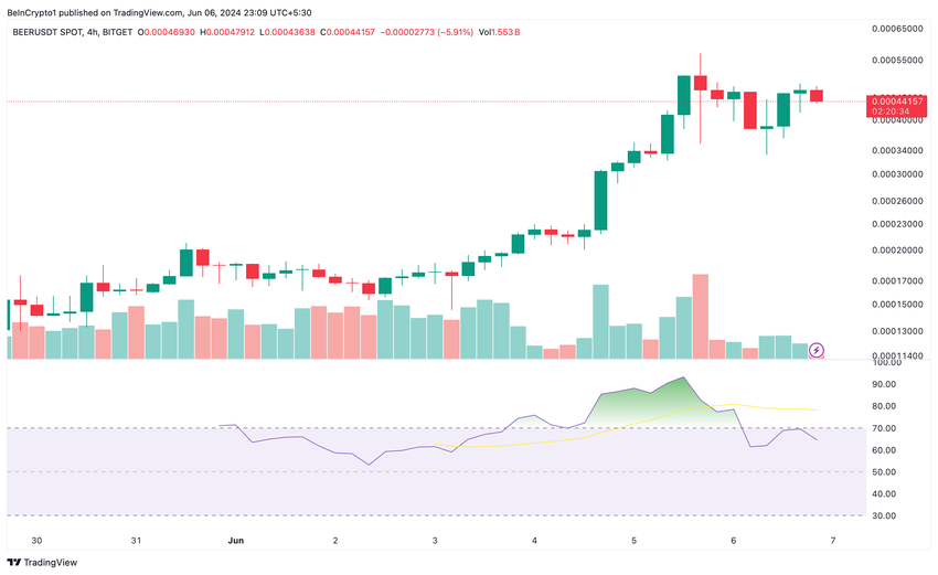 BEER:in 4 tunnin kaavion analysointi paljastaa parabolisen kasvumallin, jossa alhainen tuki on 0,00033 dollaria ja vastus 0,00047 dollaria. Kaikkien aikojen korkein (ATH) on 0,00057 dollaria. Volyymioskillaattorin linjaus hinnan kanssa viittaa liikkeeseen sekä ostajan että myyjän mielialan ohjaamana, kun taas suhteellinen voimaindeksi (RSI) on 64,4, mikä osoittaa mahdollisia yliostettuja olosuhteita.