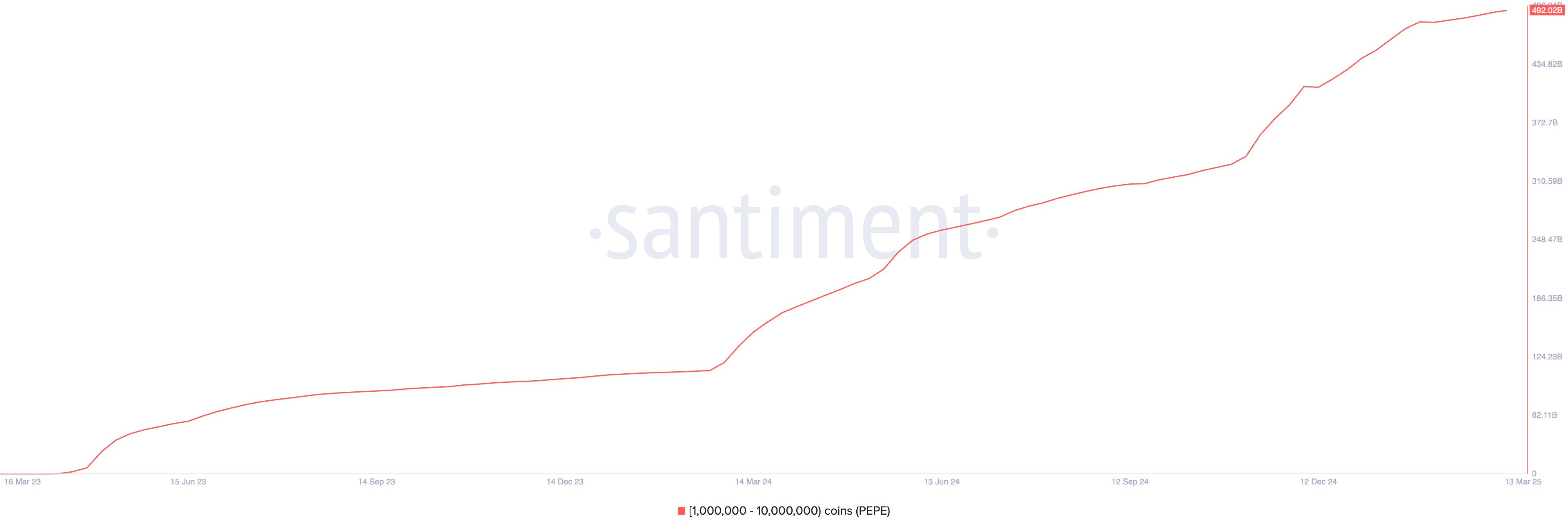 Santimentin mukaan tämä sijoittajaryhmä on hankkinut 2,6 miljardia PEPE-tokenia viimeisen seitsemän päivän aikana. Tämä ryhmä omistaa tällä hetkellä 492,02 miljardia PEPE-tokenia, mikä on heidän korkein tokenmääränsä PEPE:n lanseerauksen jälkeen.
