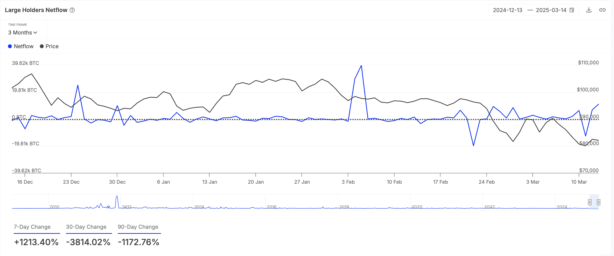 Kun nettovirta kasvaa, se viittaa siihen, että suuret sijoittajat keräävät enemmän kolikoita. Tämä nousujohteinen suuntaus voi kannustaa yksityis-sijoittajia tekemään samoin, mikä lisää BTC:n kysyntää ja asettaa enemmän painetta sen hinnalle.
