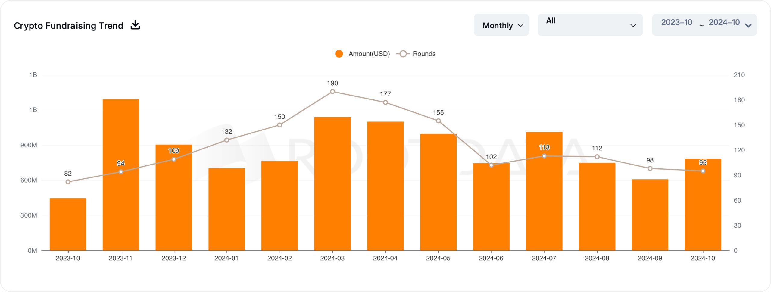 Lokakuun kokonaisrahoitusmäärä nousi 782 miljoonaan dollariin, mikä on 28,84 % enemmän kuin syyskuussa kerätyt 607 miljoonaa dollaria.