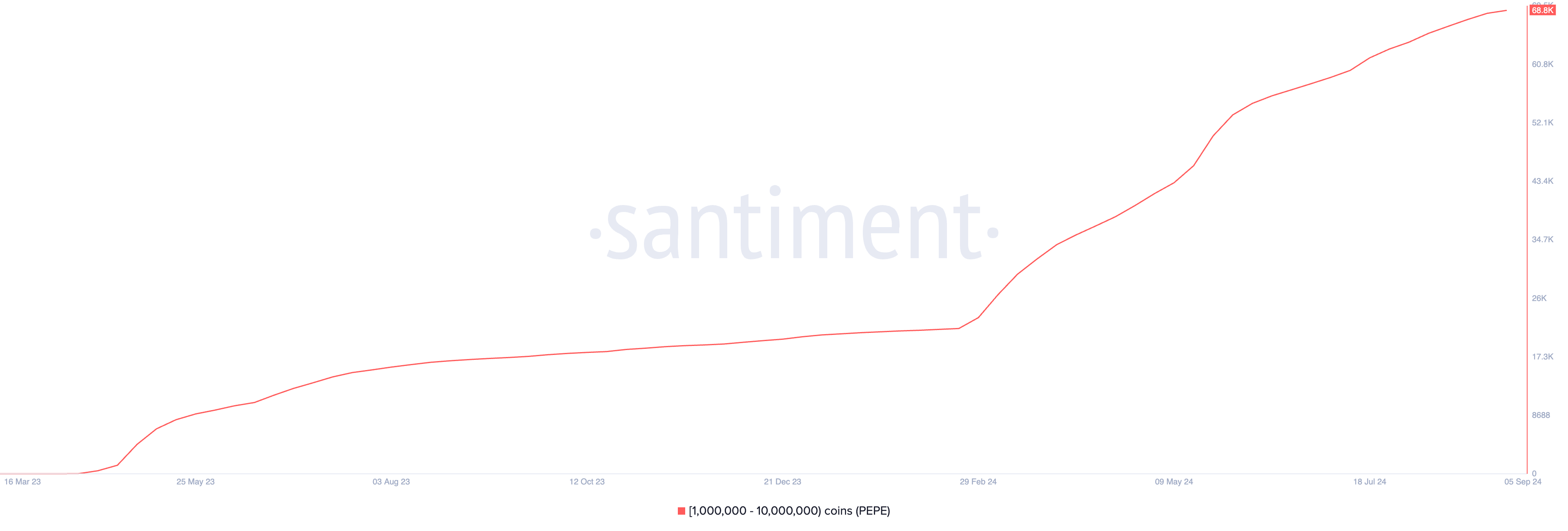 Viime viikolla ethereum-pohjaisen meemikolikon Pepe kysyntä on lisääntynyt kryptovalashaiksi luokiteltujen sijoittajien keskuudessa. Santimentin tiedot osoittavat, että osoitteiden määrä, jotka pitävät hallussaan 1 miljoonasta 10 miljoonaan pepeä, on saavuttanut ennätykselliset 69 000.