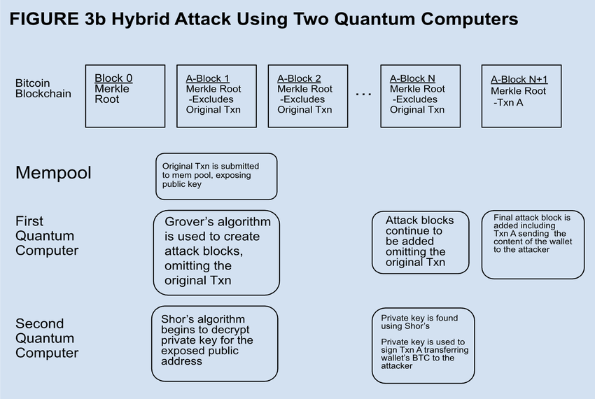 “Bitcoin-verkon hash-nopeus käyttämällä nykyisintä arvoa kvanttilaskentateknologiaa vastaan, joka kasvaa ajan mittaan samaa vauhtia Mooren lain sanelemalla tavalla. Se antaa arviolta noin 27 vuoden aikajänteen siihen, että yksittäinen kvanttitietokone pystyy täysin päihittämään muun verkon ja siten ottamaan sen täydellisen hallinnan haltuunsa”, Kentin yliopiston opetushenkilökuntaan kuuluva Dan A. Bard kirjoitti.