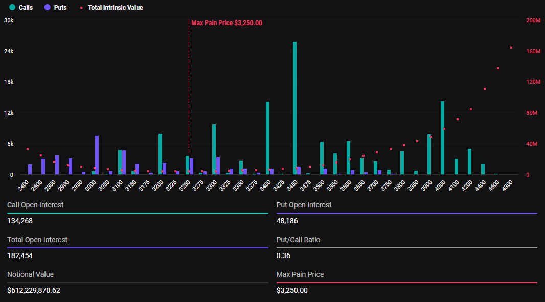 Samoin kryptomarkkinat todistavat 182 454 Ethereum-sopimuksen erääntymisen, joiden nimellisarvo on 612,2 miljoonaa dollaria. Näiden erääntyvien Ethereum-optioiden put-to-call-suhde on 0,36, ja suurin kipupiste on 3 250 dollaria.