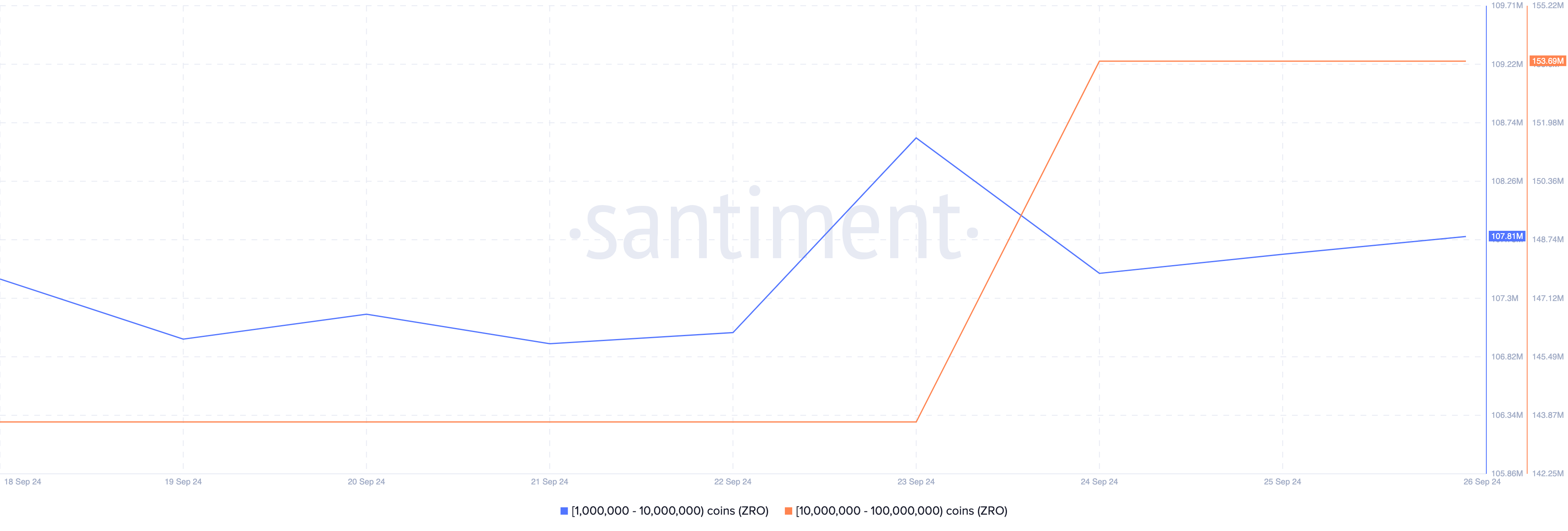 Santimentin tiedot paljastavat, että kryptovalaat ovat lisänneet ZRO-omistuksiaan viime päivinä. Erityisesti valaat, joilla on 10 miljoonasta 100 miljoonaan tokenia, ovat kerryttäneet 10,26 miljoonaa ZRO:ta lisää. Lisäksi 1 miljoonan ja 10 miljoonan kategorian sijoittajat ostivat noin 300 000 tokenia lisää.