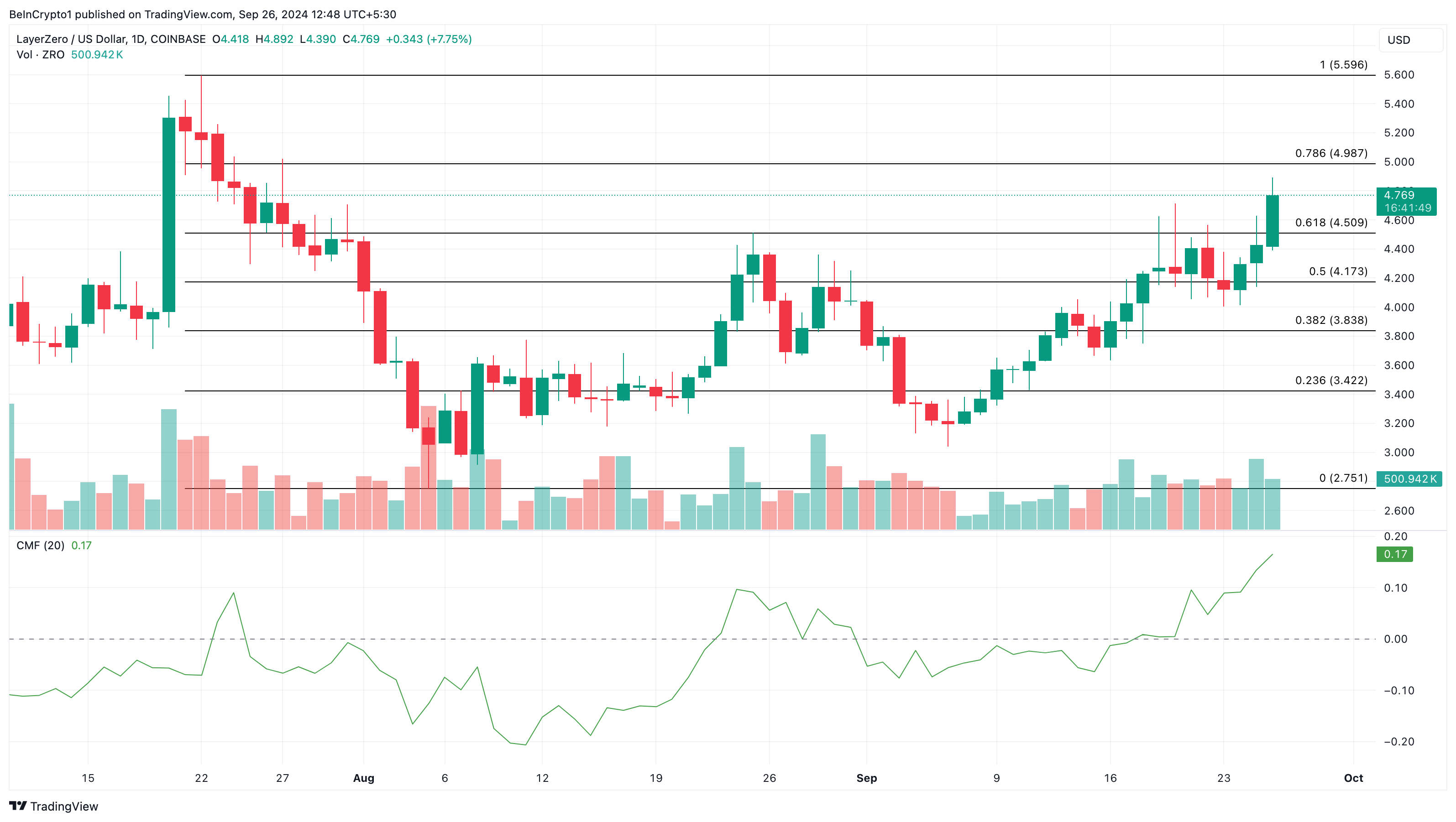 Lisäksi CMF:n nousu antaa lisää uskottavuutta ZRO:n hinnan jatkuvan nousun suhteen, mikä viittaa siihen, että tokenin hinta voi haastaa sen kaikkien aikojen korkeimman hinnan ja saavuttaa 5,60 dollaria.