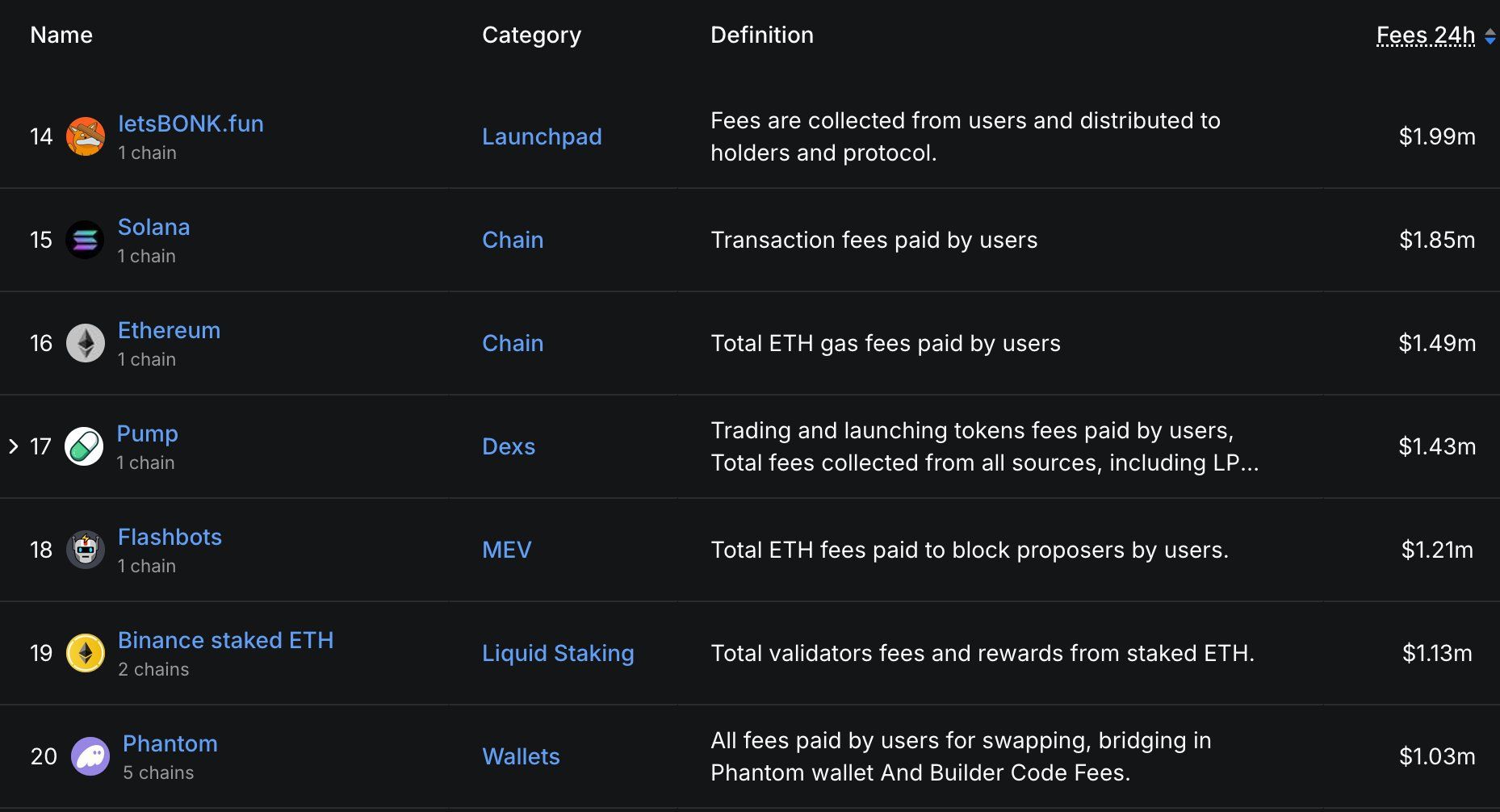 LetsBonk on myös äskettäin ottanut huomion keskipisteen suurelta kilpailijaltaan, Pump.funilta. Viimeisimmät tiedot osoittavat, että alusta tuotti 1,99 miljoonaa dollaria kaupankäyntimaksuja 24 tunnin aikana.