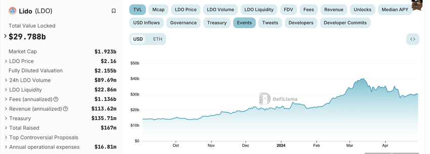 Tästä maamerkistä huolimatta Lidon lukittu kokonaisarvo (TVL) on laskenut huomattavasti. Maaliskuun puolivälin 40,16 miljardin dollarin huipusta se on laskenut 29,78 miljardiin dollariin, mikä merkitsee noin 25 prosentin laskua.