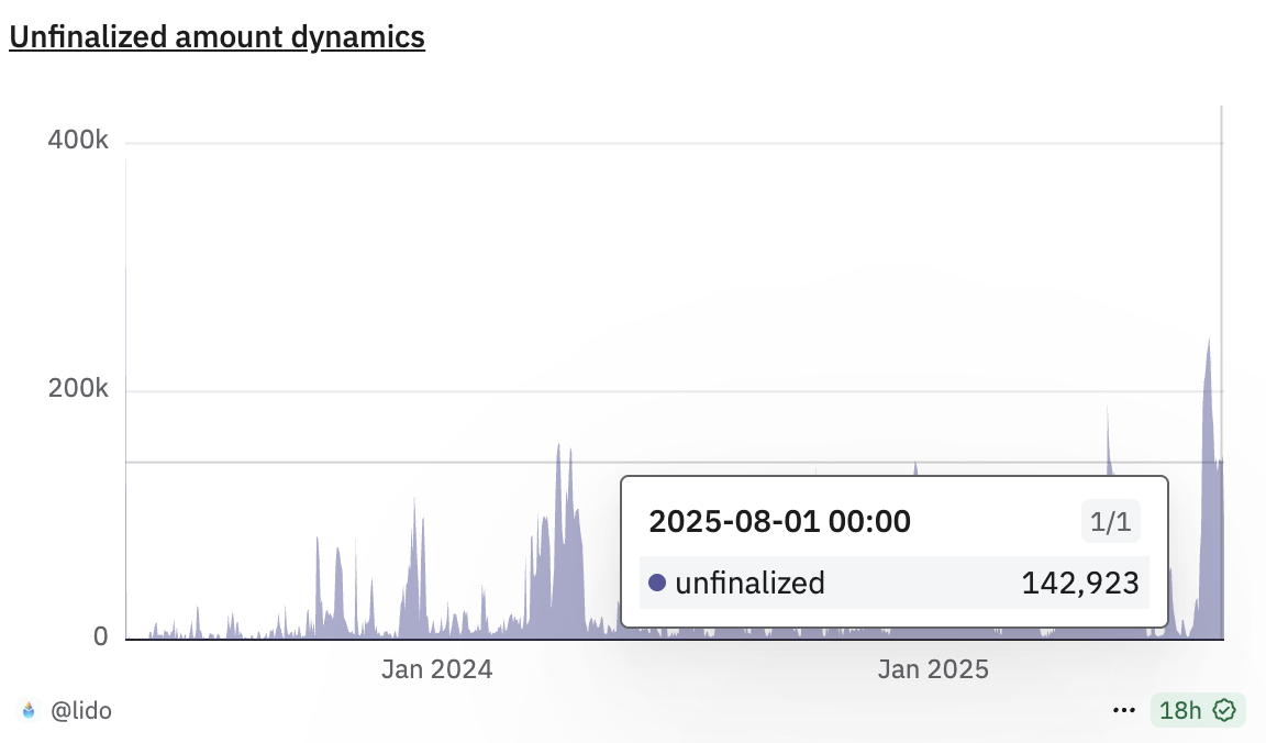 Lisäksi Lidon ETH-nostojono on saavuttanut korkeimman tasonsa sen jälkeen, kun nostot mahdollistettiin. Dune-tietojen mukaan odottava ETH-nosto on lähes 143 000. Vaikka tämä luku on laskenut kaikkien aikojen huipusta heinäkuun lopussa, se heijastaa silti luottamuksen muutosta joidenkin käyttäjien keskuudessa, erityisesti kun joustavampia tai turvallisempia panostusvaihtoehtoja ilmestyy.