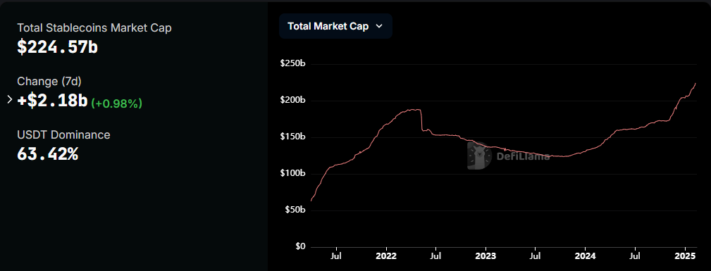 Stablecoin-markkinat ovat olleet nousussa, saavuttaen uuden huipun 224,5 miljardia dollaria helmikuussa. Tämä kasvu heijastaa stablecoinien kasvavaa merkitystä digitaalisessa taloudessa ja korostaa niiden roolia Yhdysvaltain dollarin vaikutusvallan laajentamisessa perinteisten rahoituslaitosten (TradFi) ulkopuolelle.