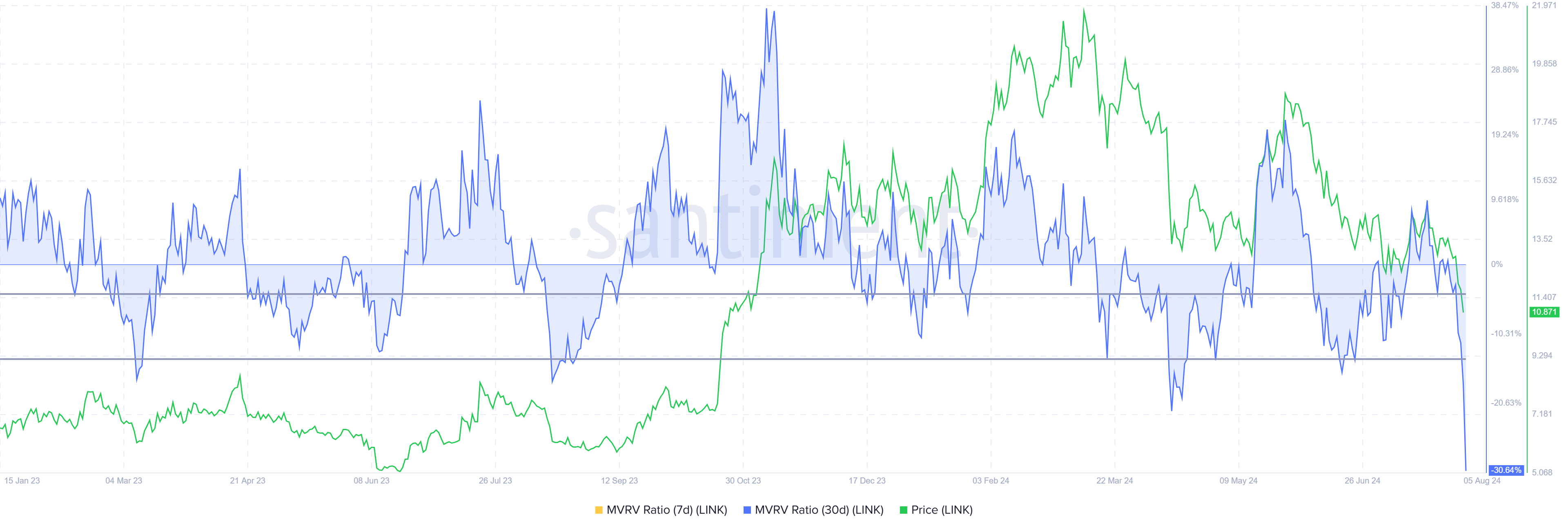 MVRV-suhde arvioi sijoittajien voitot ja tappiot. Tällä hetkellä Chainlinkin 30 päivän MVRV on -30 %, mikä osoittaa äärimmäisiä tappioita, mutta hyvin vähäistä myyntipainetta. Historiallisesti LINK MVRV välillä -4 % ja -14 % tyypillisesti viestii toipumisten ja hintarallien alkamisesta, merkiten kokoamismahdollisuuden aluetta.