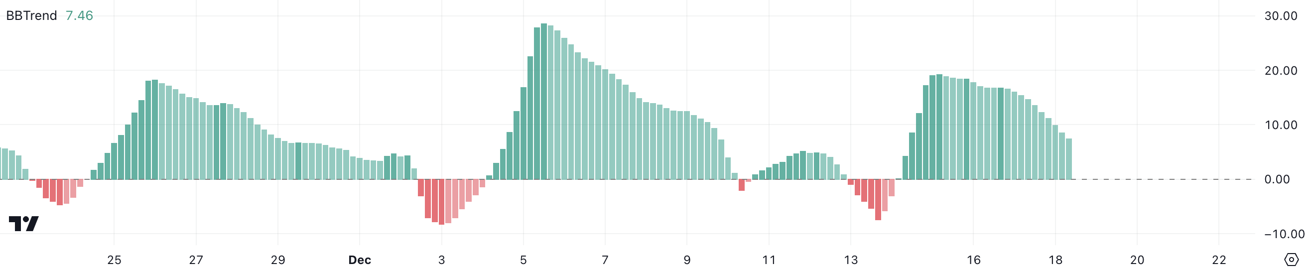 Chainlink BBTrend on tällä hetkellä 7,46, mikä heijastaa positiivista trendiä joulukuun 14. päivästä lähtien, mutta osoittaa heikkenemisen merkkejä huipun ollessa 19,31 joulukuun 15. päivänä.
