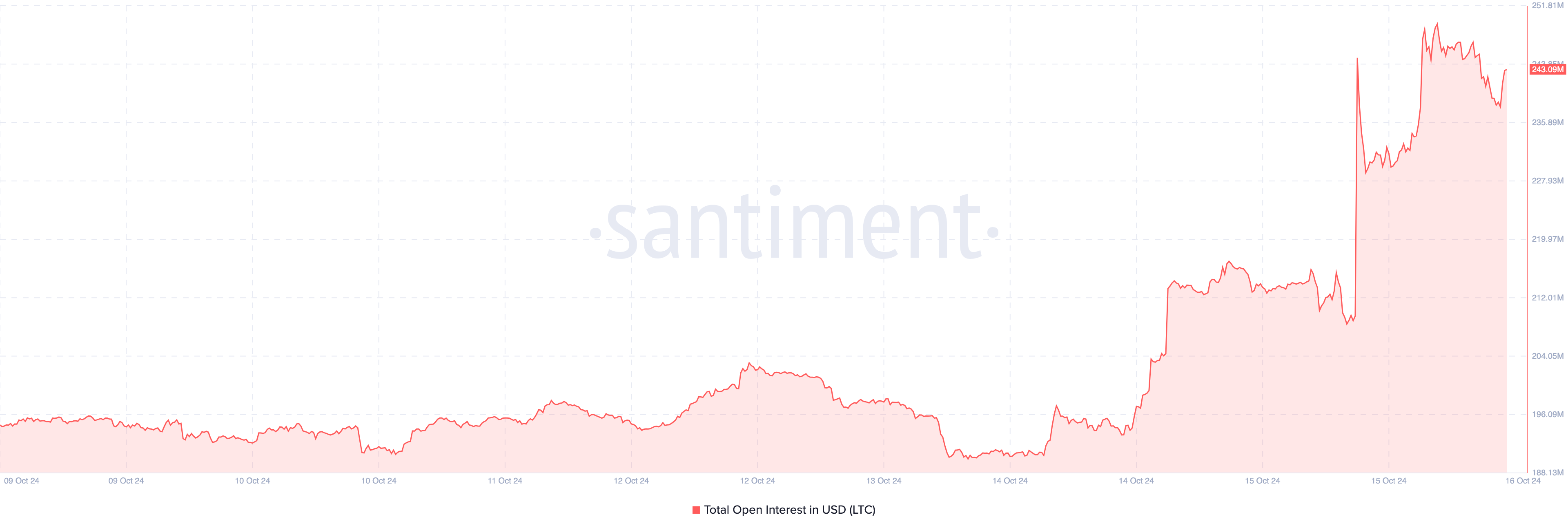 Lisäksi Litecoinin Open Interest nousi 243,09 miljoonaan dollariin. OI, kuten sitä yleisesti kutsutaan, viittaa avoimien sopimusten arvon summaan markkinoilla. Kun se vähenee, kauppiaat poistavat likviditeettiä kryptovaluuttaan liittyvistä sopimuksista.