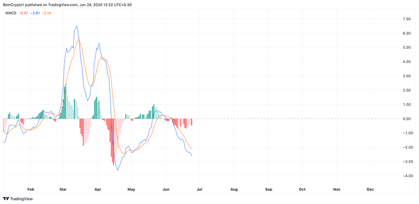 Sen liukuvan keskiarvon konvergenssi/divergenssi (MACD) -indikaattorin lukemat viittaavat tokenin arvon jatkuvan laskun mahdollisuuteen. Tämä indikaattori auttaa kauppiaita tunnistamaan mahdolliset osto- ja myyntisignaalit.