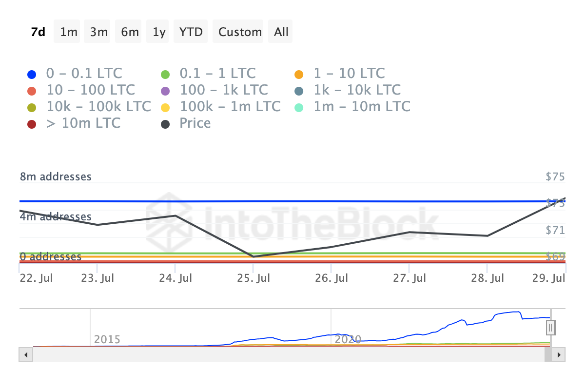 Lisäksi viime kuukauden aikana on myös ollut kasvua osoitteiden määrässä, jotka pitävät suuren määrän LTC:tä. IntoTheBlockin mukaan osoitteiden määrä, jotka pitävät 1 miljoonasta 10 miljoonaan, on kasvanut 33%.