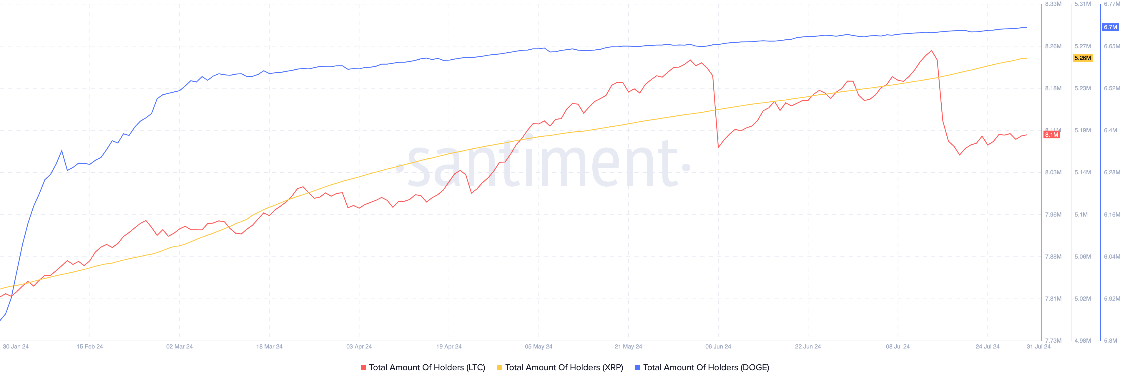 Kirjoitushetkellä Litecoinilla on yli 8 miljoonaa omistajaa. XRP:llä ja DOGE:lla nämä luvut ovat kasvaneet. Siitä huolimatta Litecoinilla on edelleen enemmän omistajia kuin Dogecoinilla ja Ripplella, joilla on vastaavasti 6,70 miljoonaa ja 5,26 miljoonaa omistajaa.