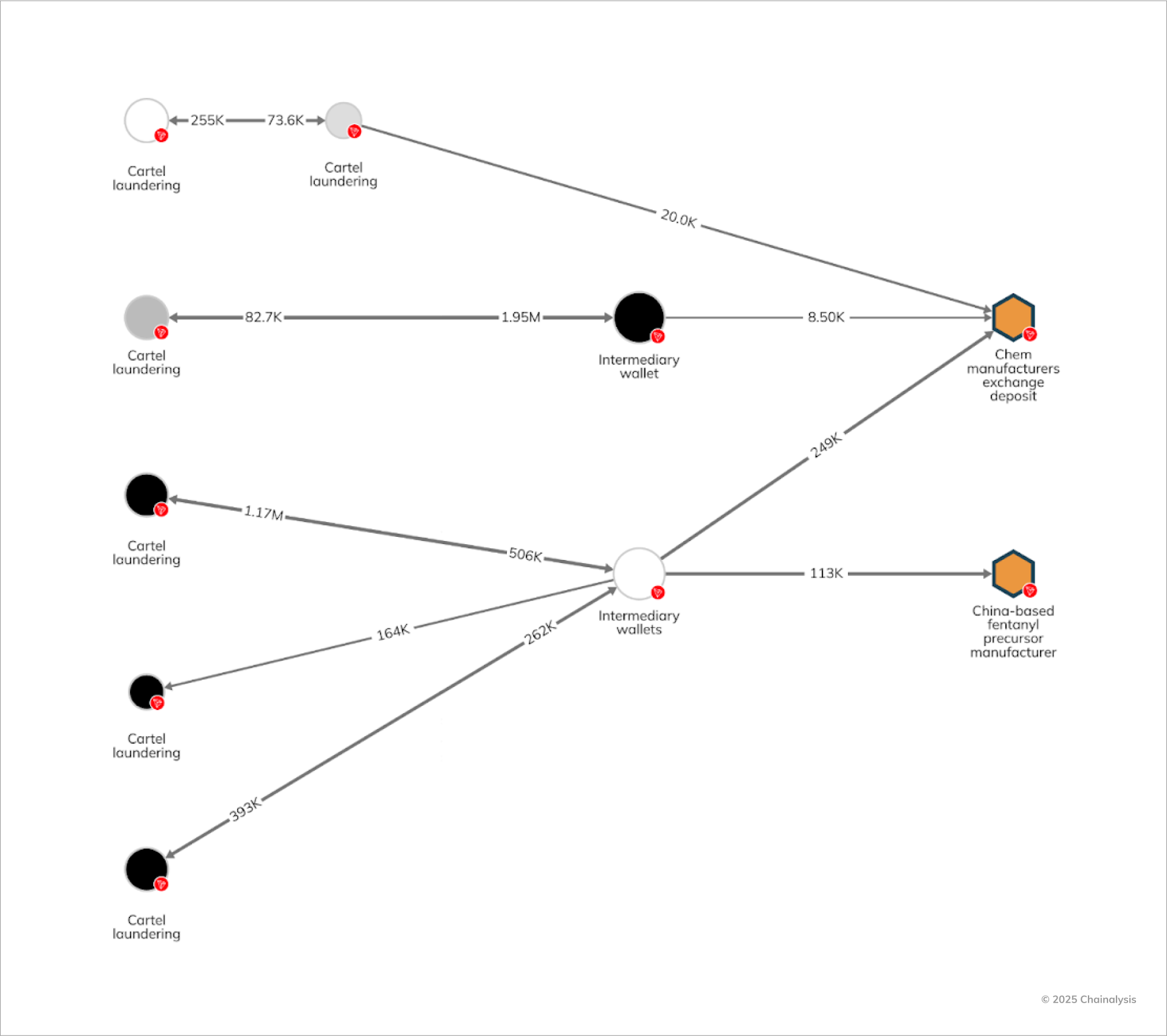 Chainalysis käytti analyysityökalujaan jäljittääkseen varojen virtaa keskitettyjen pörssitilien ja epäilyttävien krypto-osoitteiden kautta. He havaitsivat, että fentanyylin salakuljettajat käyttävät kryptovaluuttaa, erityisesti Bitcoinia (BTC) ja stablecoineja, ostaakseen esiastekemikaaleja kiinalaisilta toimittajilta.