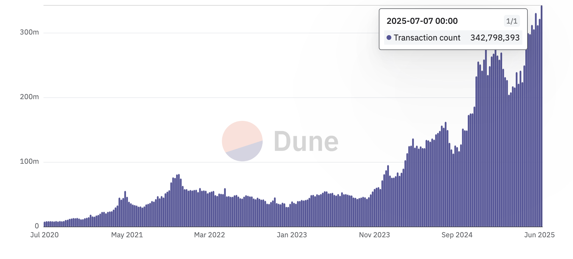 Viimeisen viikon aikana julkisten lohkoketjujen ja Layer-2-verkkojen kokonaistransaktiomäärä on saavuttanut ennätyskorkeuden.