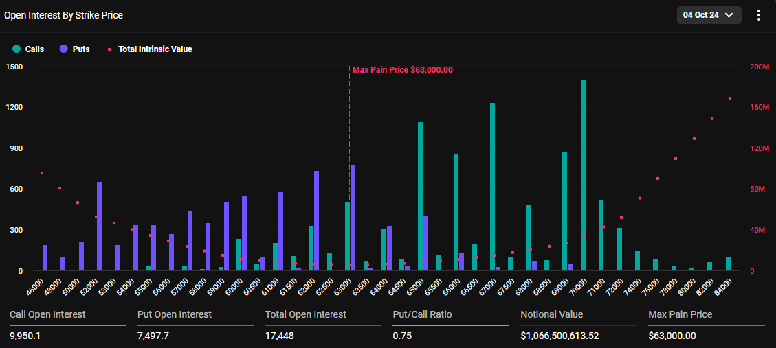 Deribitin tiedoista ilmenee, että 17 448 Bitcoin-optiosopimusta vanhenee 4. lokakuuta. Sopimuksilla on put-to-call-suhde 0,75 ja suurin kipupiste 63 000 dollaria.