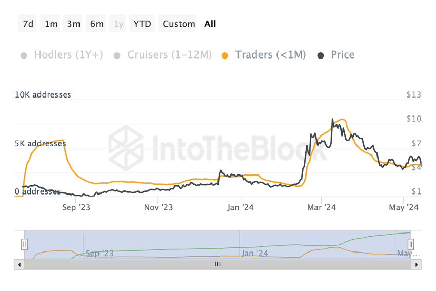 Oranssin viivan edustamana kauppiaat, jotka ovat pitäneet WLD: tä alle kuukauden, ovat osoittaneet merkittävää aktiivisuutta. Kauppiaiden osoitteiden määrä kasvoi dramaattisesti tammikuun 2024 puolivälin tienoilla ylittäen hinnan.