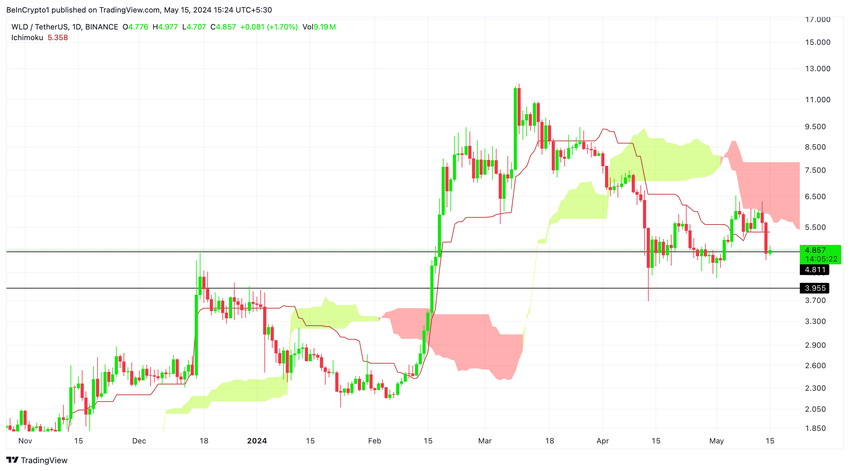 - Kriittiset tukitasot: Jos WLD jatkaa kaupankäyntiä pilven ja Tenkan-linjan alapuolella, suosittelemme kauppiaita harkitsemaan ostamista 3,95 dollarin tukitasolla. Tämä hintapiste on erittäin herkkä ja toimii ratkaisevana tukitasona. Jos hinta rikkoutuu alle 3,95 dollarin, WLD voi kokea laskun edelleen, mahdollisesti pudoten 3,30 dollariin.