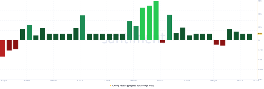WLD:n hinnan laskusta ja avoimen kiinnostuksen laskusta huolimatta tokenin yhteenlaskettu rahoitusaste kryptovaluuttapörsseissä on pysynyt pääosin positiivisena. Lehdistöhetkellä WLD:n rahoitusaste on 0,01 %.
