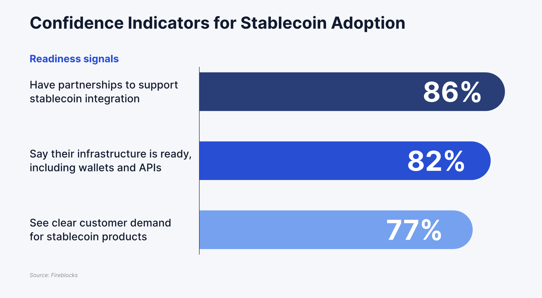 Stablecoinien tukemiseen tarvittava infrastruktuuri on myös valmis, sillä 86% organisaatioista uskoo, että lompakot, API:t ja vaatimustenmukaisuustyökalut vastaavat heidän tarpeitaan. Turvallisuus korostuu, ja 36% johtajista sanoo, että parantunut turvallisuus edistää laajempaa käyttöönottoa.