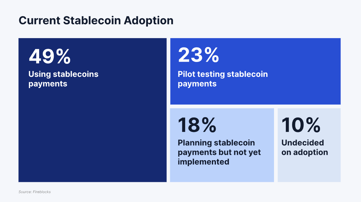 Fireblocksin “State of Stablecoins 2025” -raportin mukaan 49% organisaatioista maailmanlaajuisesti on käyttänyt stablecoineja maksuihin, kun taas 41% on testausvaiheessa tai suunnittelee niiden käyttöönottoa.