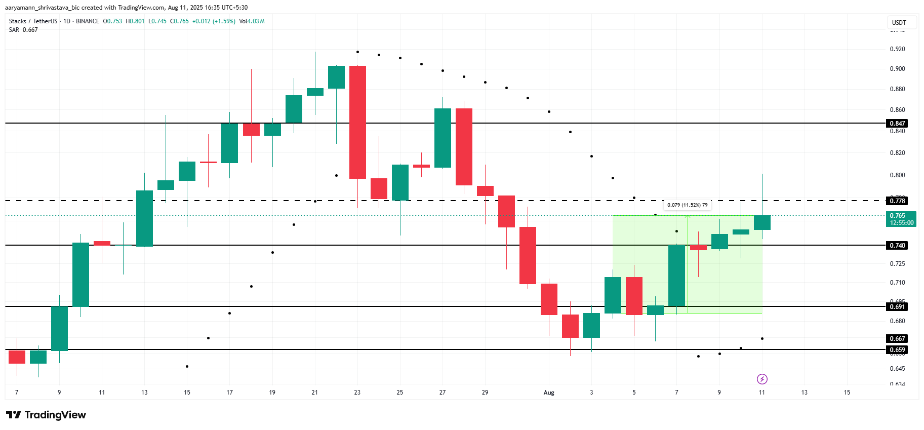 Kuitenkin, jos STX ei onnistu ylittämään 0,778 dollarin vastustasoa, se saattaa kohdata laskupainetta. Lasku alle 0,740 dollarin tukitason voisi viitata käänteeseen, jolloin STX putoaisi 0,691 dollariin.