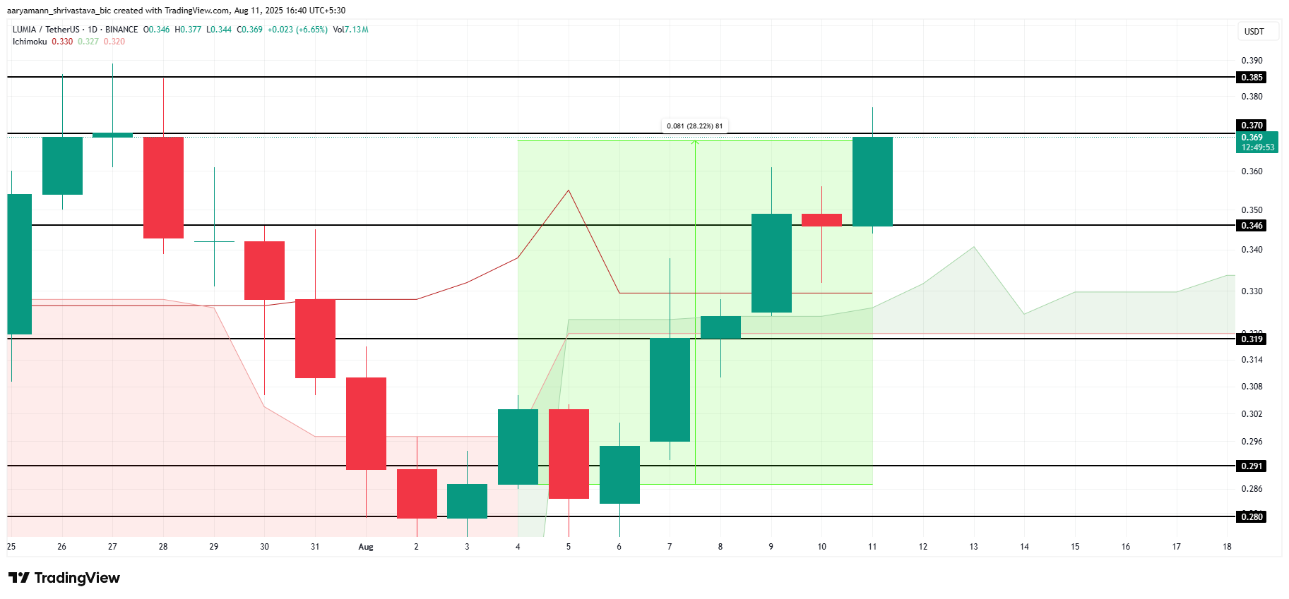LUMIA on noussut 28 % viimeisen seitsemän päivän aikana, siirtyen 0,288 dollarista 0,369 dollariin. Altcoin on noussut yhdeksi parhaiten menestyvistä Made in USA -kolikoista, houkutellen sijoittajien huomiota.