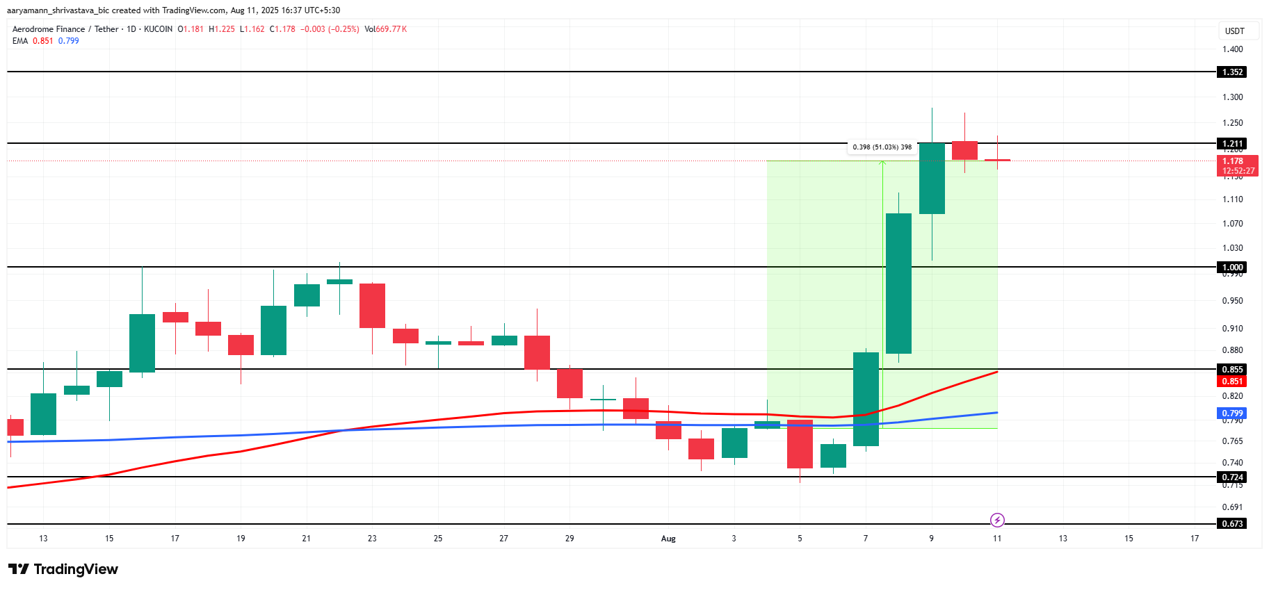 Eksponentiaaliset liukuvat keskiarvot (EMA) muodostivat Golden Crossin heinäkuun lopussa, mikä viittaa härkäiseen tunnelmaan. Tämä tekninen kuvio voisi ajaa AERO:n yli 1,21 dollarin vastustason, tavoitellen 1,35 dollaria.